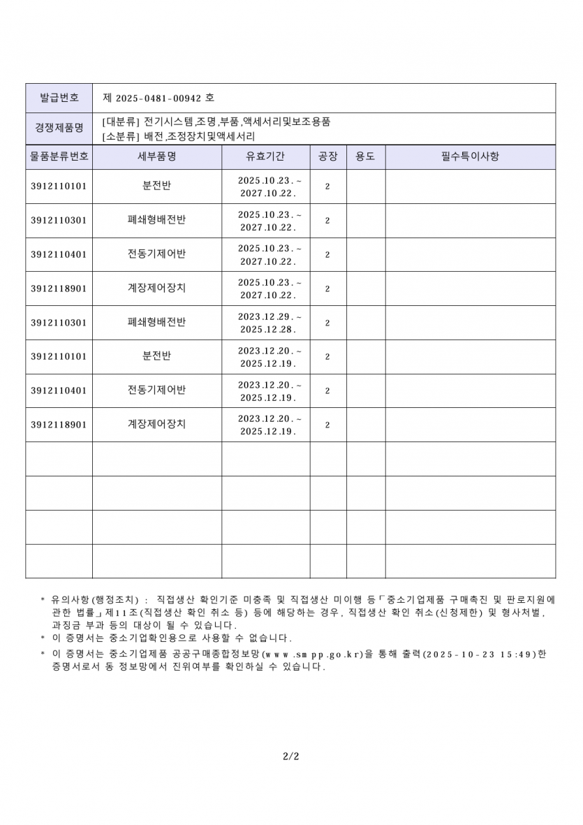 (주)인아웃오토메이션_직접생산확인증명서-분전반,전동기제어반,계장제어장치,폐쇄형배전반